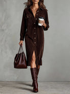 A comfortable and stylish midi dress crafted from soft corduroy, featuring a loose silhouette, double chest pockets, and a classic single-breasted front. Perfect for everyday wear with a touch of retro charm.